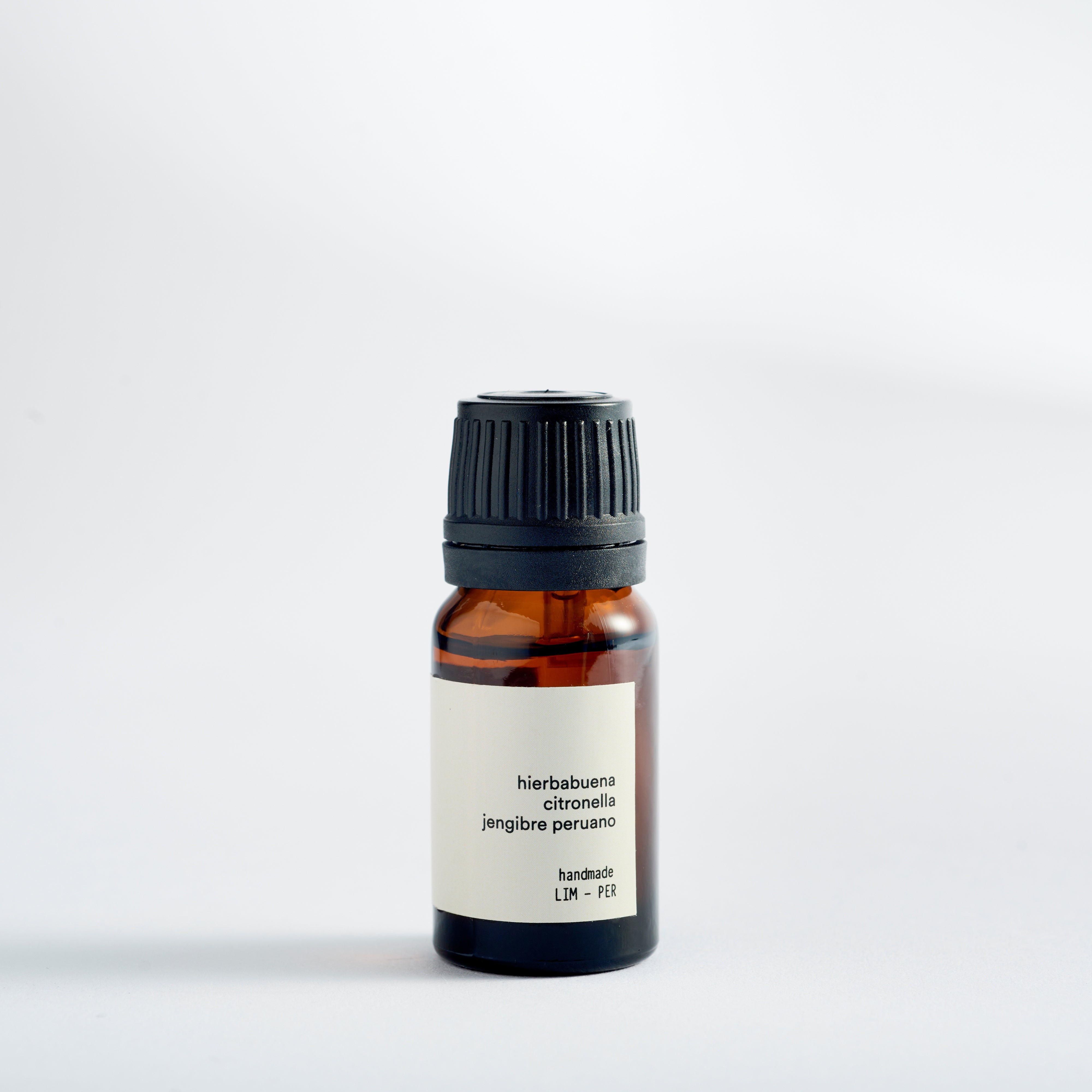- Aceite esencial de hierbabuena, aceite esencial de citronella y aceite esencial de jengibre peruano.