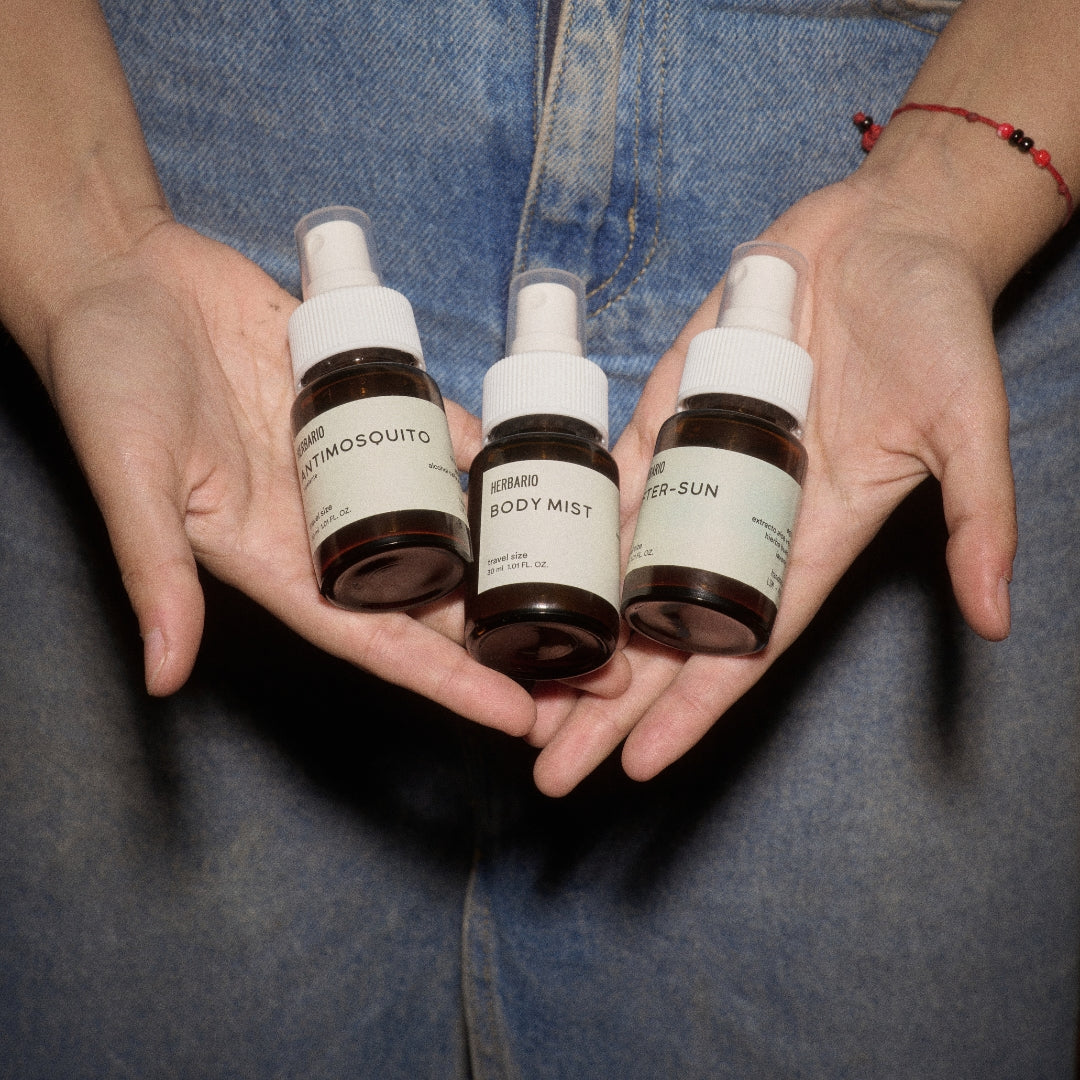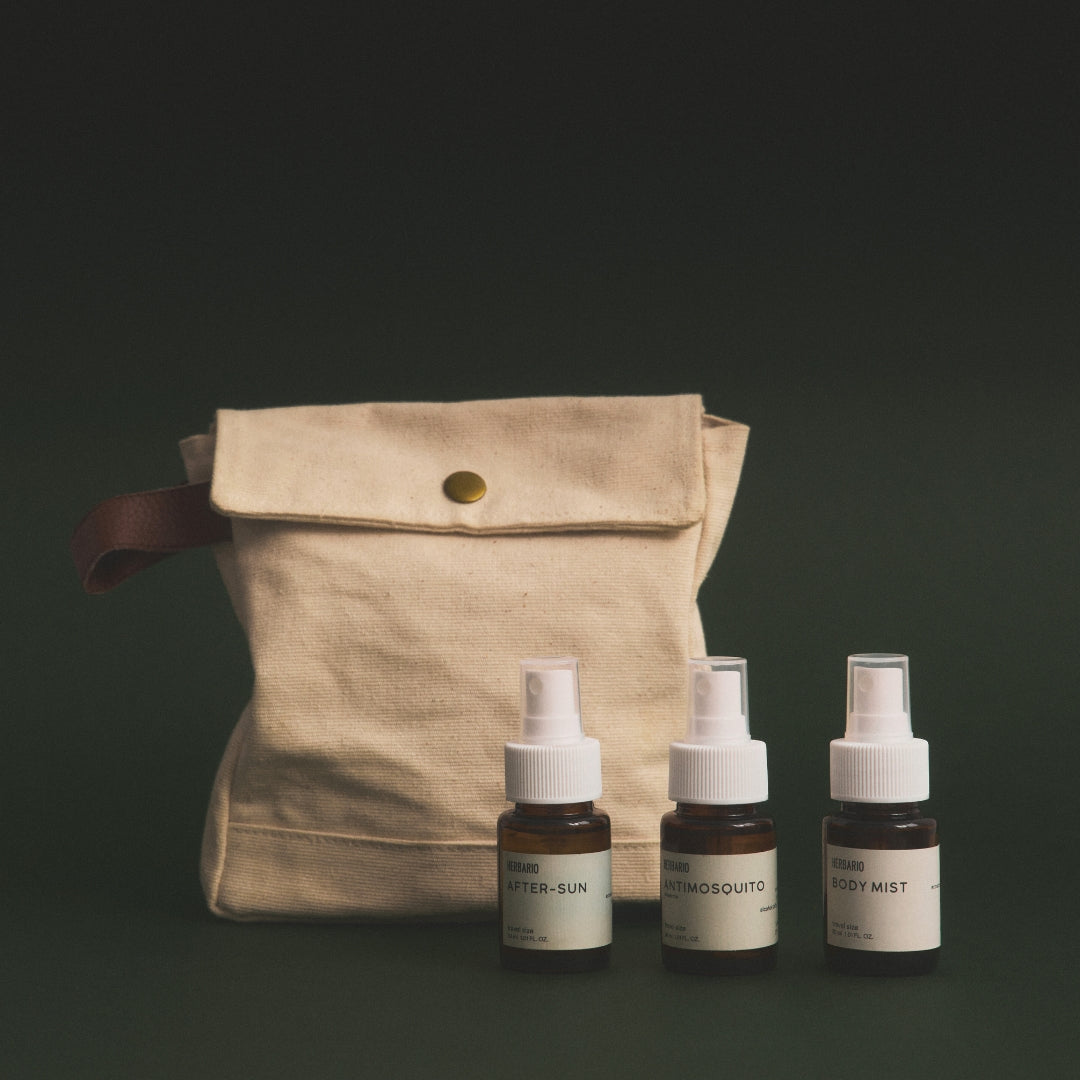 Viaja a la playa o el campo con estos infaltables mini de 30ml que vienen dentro un neceser de yute y cuero. El BODY MIST agua floral para refrescar cualquier momento del día, ANTI MOSQUITO repelente para todos los insectos y AFTER SUN para refrescar y calmar.